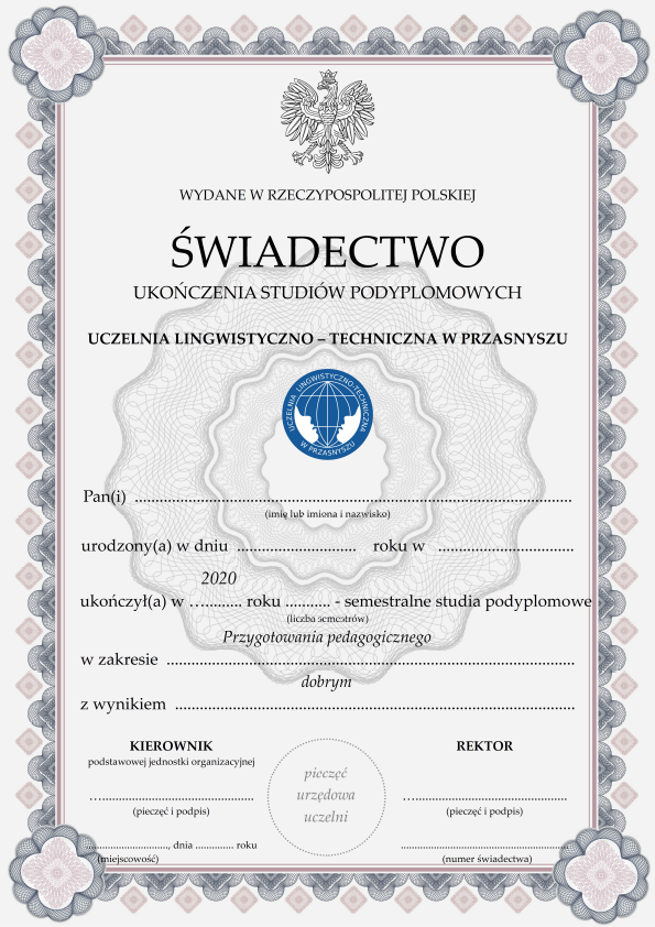 Pamiętaj, nasze Pedagogiczne Studia Pedagogiczne są w pełni legalne – Uczelnia Lingwistyczno-Techniczna w Przasnyszu jest uczelnią niepubliczną z uprawnieniami szkoły publicznej. Jest wpisana do rejestru szkół wyższych pod nr 306 (decyzja Ministra Edukacji Narodowej i Sportu z dnia 16 września 2004 r.; nr DSW–3-4011-262/II/04)
